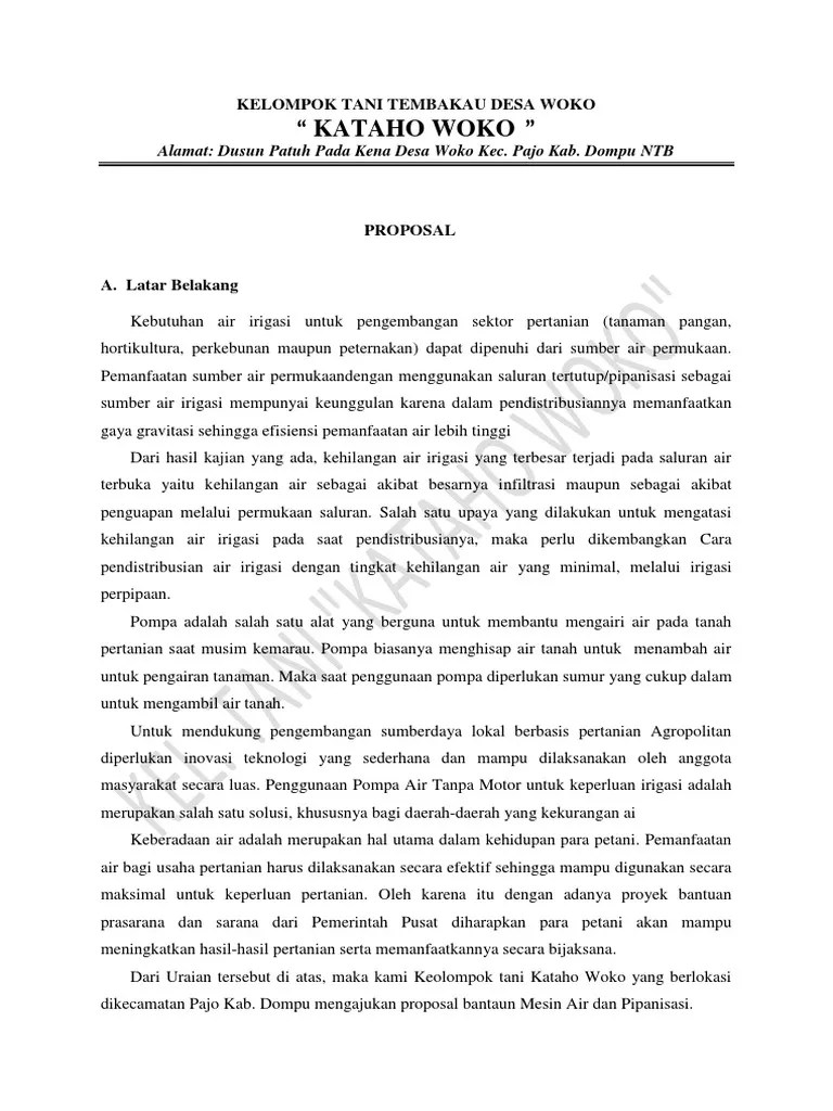 Berikut informasi sepenuhnya tentang contoh proposal pengajuan pipanisasi air bersih. Kelompok pengelola sistem penyediaan air minum dan sanitasi. Puji syukur kehadirat tuhan yang maha esa atas selesainya penyusunan proposal pembangunan sarana pipa air bersih di dusun tuban,dusun sumur duyung,dusun sempak, . Permohonan bantuan untuk pembangunan mck di majelis . Terciptanya lingkungan yang sehat dan bersih. Nah, proposal adalah cara yang bisa . Problemnya adalah apakah dengan anggaran desa yang terbatas bisa memenuhi kebutuhan sarana air bersih ini?. Bantuan program pipanisasi air bersih pedesaan, kiranya bapak berkenan. Kebutuhan untuk air minum di wilayah ini diambil dari mata air yang ada disekitar pedukuhan gayam dengan cara pipanisasi dan pembuatan bak . Doc proposal pipanisasi cikadondong achmad ridwan academia edu. Pengajuan proposal csr atau penyerahan proposal desa kepada perusahaan dapat. Sumur bor (air bawah tanah) untuk memenuhi kebutuhan air bersih . P r o p o s a l permohonan bantuan dana pembangunan sarana sumur bor kp.